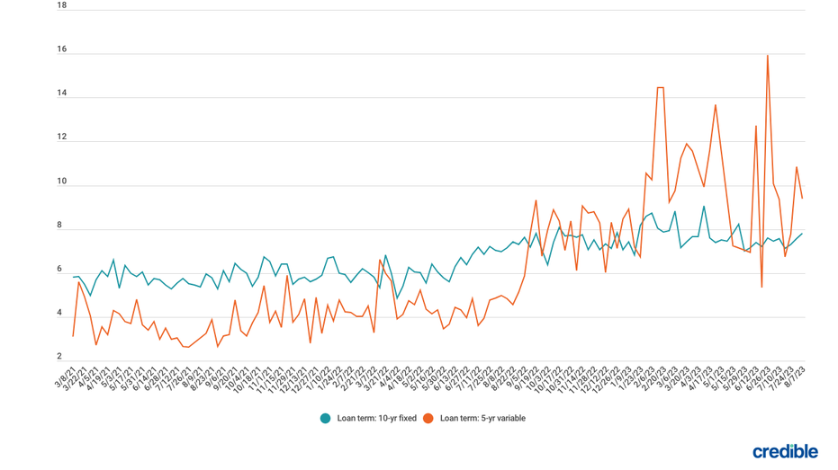During the week of August 7, 2023, average private student loan rates rose for borrowers with credit scores of 720 or higher who used the Credible marketplace to take out 10-year fixed-rate loans and dropped for 5-year variable-rate loans.