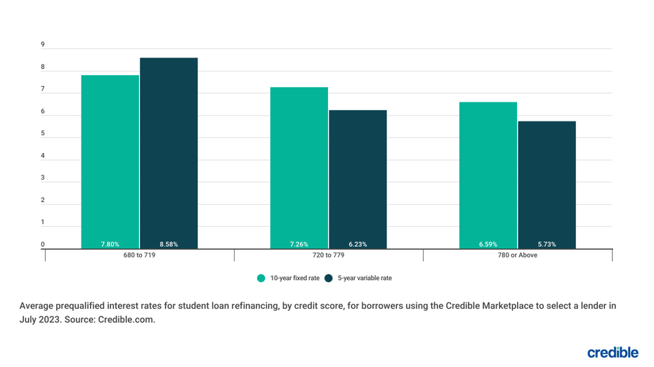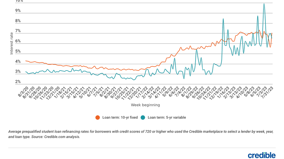 Rates for well-qualified borrowers using the Credible marketplace to refinance student loans decreased this week for 5-year variable-rate loans and increased for 10-year fixed-rate loans.
