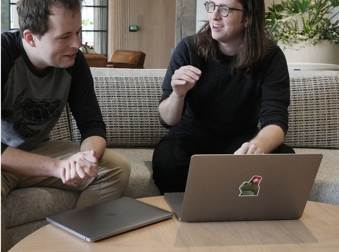 In the image, on the back of an OpenAI employee’s laptop, there is a sticker of crypto meme Froge the Frog.
